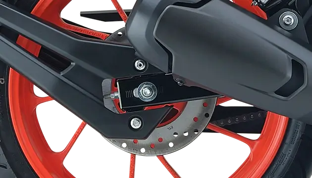 The vermillion alloy wheels add a striking contrast to the bike’s body, reflecting your bold personality and energetic lifestyle.